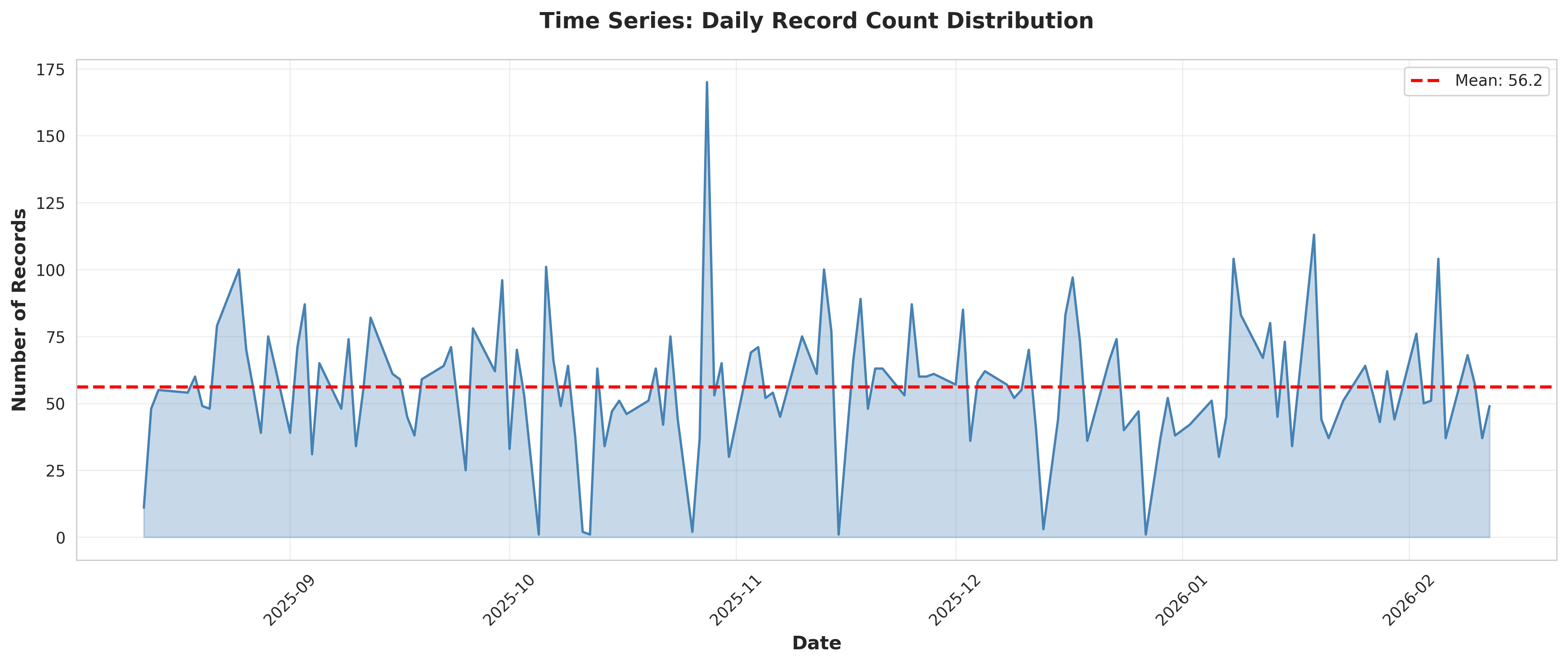 table_06_overall_statistics.csvStatistic,Value Total Records,"7,642" Unique Dates,136 Date Range (days),183 Average Records per Day,56.19 Median Records per Day,54.50 Std Dev Records per Day,24.14 Coefficient of Variation (%),42.97 Min Records per Day,1 Max Records per Day,170 Records per Hour (avg),318.42 Most Common Hour,09:00 Most Common Day,Tuesday
